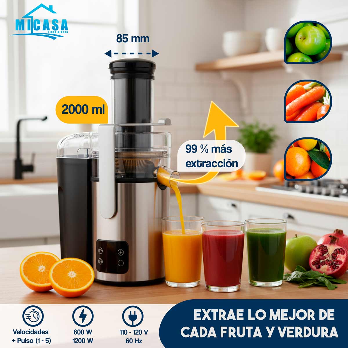 El Extractor de Jugos MiCasa combina potencia, diseño moderno y funcionalidad para ayudarte a preparar jugos naturales de forma rápida y segura. Equipado con un motor de aluminio revestido de cobre y una potencia nominal de hasta 1200 W, es ideal para obtener el máximo rendimiento de frutas y verduras. Cuenta con múltiples niveles de velocidad, pantalla LED y un sistema de protección de seguridad que garantiza un uso cómodo y confiable en todo momento.