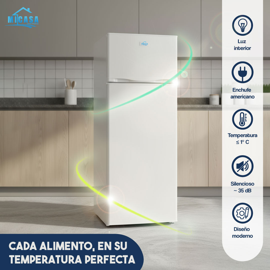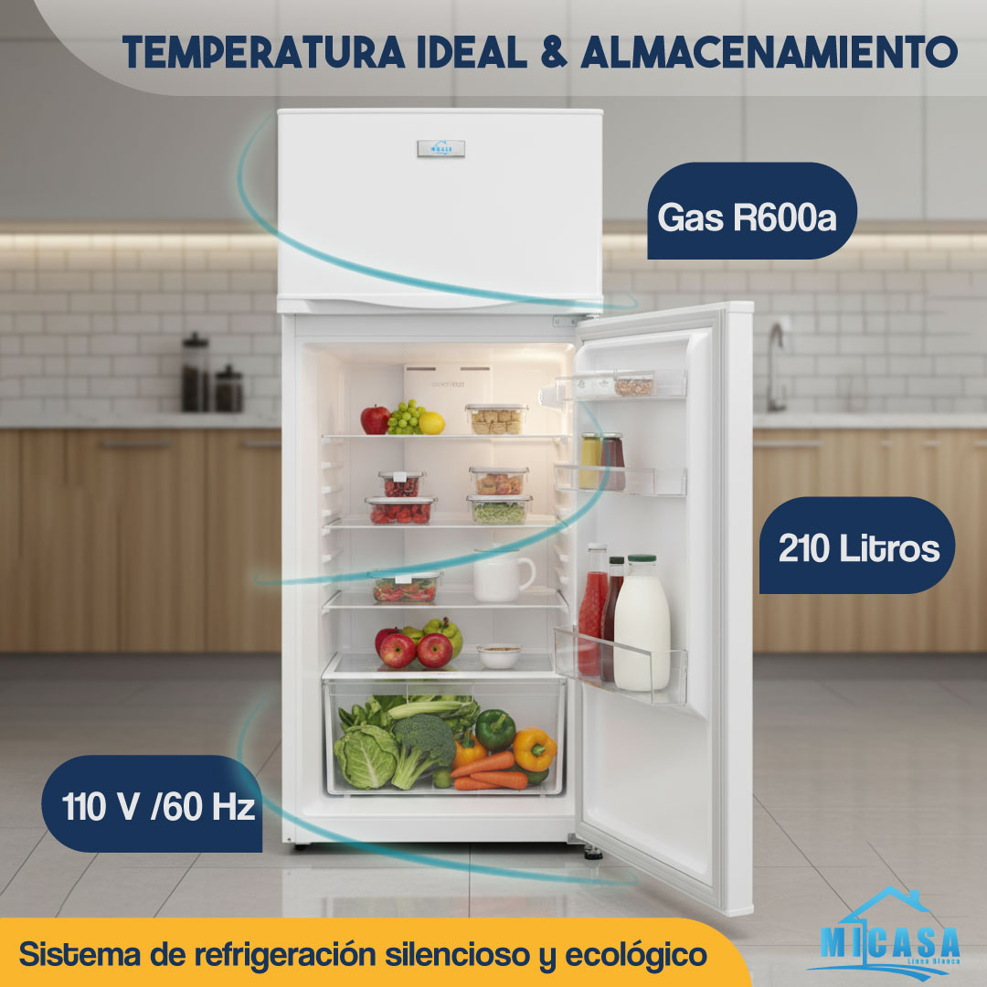 La Refrigeradora MiCasa de 210L es la opción ideal para quienes buscan eficiencia, funcionalidad y diseño limpio en un solo electrodoméstico. Con capacidad de 210 litros y un sistema de enfriamiento eficiente con gas refrigerante R600a, mantiene tus alimentos frescos y organizados. Su diseño compacto en color blanco incluye estante de cristal, luz interior y asa empotrada para un acceso cómodo y moderno.
